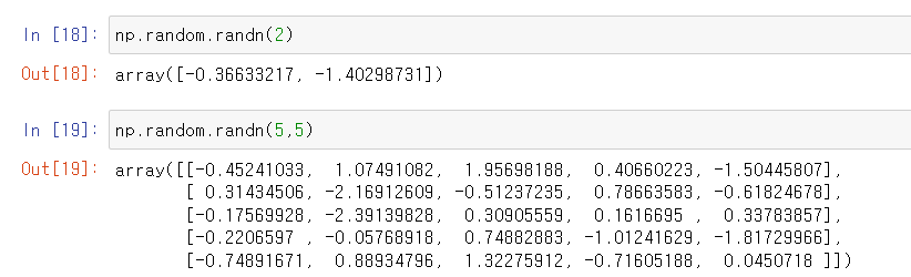 Returns a sample(or samples) from the "standard normal" distribution [σ = 1]. Unlike rand which is uniform, values closer to zero are more likely to appear. [reference]