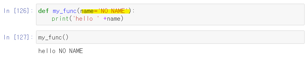 - default parameter 또는 default argment 값을 지정하고 싶다면, fuction을 생성할 때 ()안에 equal(=) to '값' 지정함