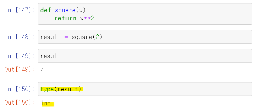 result = square(2)를 실행하면 4 값을 출력하지만 result를 실행하면 아무 값도 나오지 않음